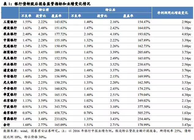 因此,對于銀行而言,轉(zhuǎn)出撥備計(jì)提充分的不良,會(huì)貢獻(xiàn)賬面利潤。我們以銀行中報(bào)數(shù)據(jù)為起點(diǎn),大致測算下,如果各銀行的不良貸款中有10%做債轉(zhuǎn)股轉(zhuǎn)出,不良撥備100%,轉(zhuǎn)讓價(jià)30%,那么將使利潤增速比原來增加1-5個(gè)百分點(diǎn)。