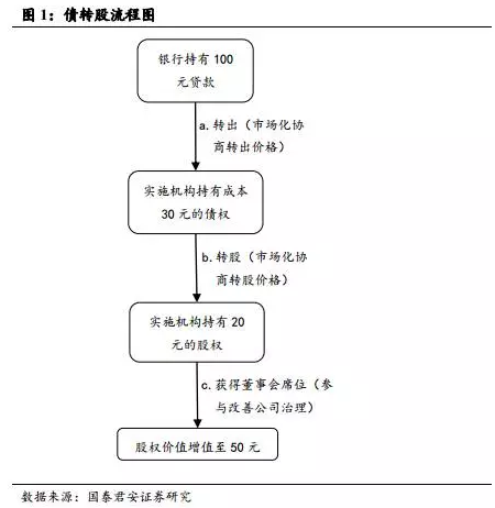 10月10日國務(wù)院公布的《關(guān)于市場化銀行債權(quán)轉(zhuǎn)股權(quán)的指導(dǎo)意見》(后文簡稱《指導(dǎo)意見》)中明確了市場化債轉(zhuǎn)股的原則。債轉(zhuǎn)股邏輯在此就不文字贅述了,只用一個(gè)虛擬案例描述其流程(按照《指導(dǎo)意見》)。